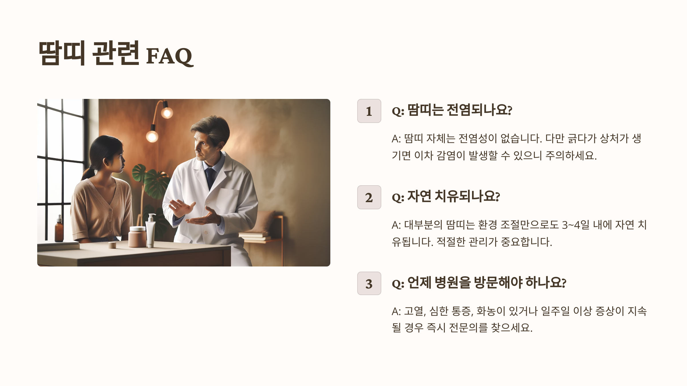 지속적으로 같은 부위에 땀띠가 생긴다면, 피부과 진료를 받아 근본 원인(예: 피부염, 아토피)을 확인하는 것도 방법이에요. 증상이 3일 이상 지속되거나 고름, 통증이 동반된다면 병원을 꼭 방문해야 해요.