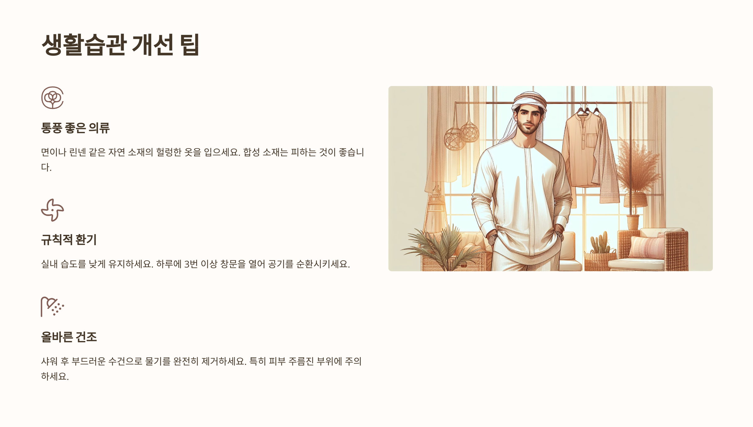 땀띠는 한 번 생기면 계속 재발할 수 있기 때문에 '관리'가 정말 중요해요. 단순히 가려움만 줄이는 것이 아니라, 피부 상태를 건강하게 유지하는 게 핵심이에요. 가장 먼저 신경 써야 할 건 바로 **통풍**이에요. 옷이나 속옷을 고를 때 땀이 쉽게 마를 수 있는 소재인지 꼭 확인해보세요.