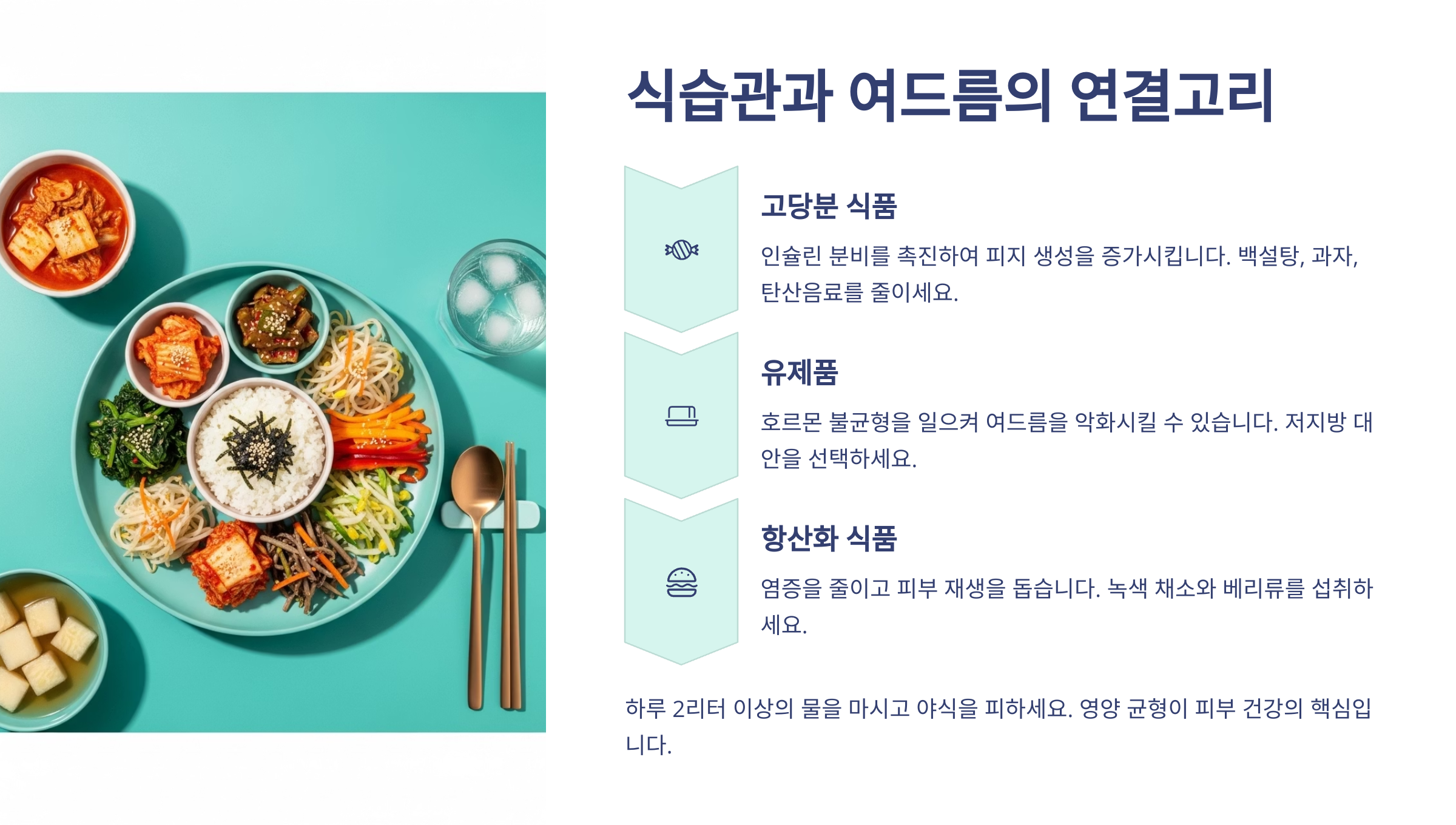 피부는 우리가 먹는 음식에 아주 민감하게 반응해요. 여름철 여드름이 심해지는 원인 중 하나가 바로 잘못된 식습관이에요. 기름진 음식, 당분이 많은 간식, 카페인 음료가 여드름을 유발하거나 악화시키는 대표적인 음식들이에요.