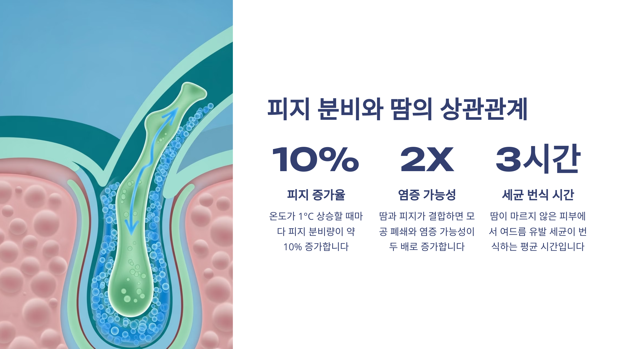 땀과 피지는 피부 위에서 혼합되어 노폐물을 붙잡는 성질이 있어요. 이 노폐물들이 모공을 막고, 여기에 세균이 번식하면 염증성 여드름으로 발전하는 거죠. 특히 이마, 코, 턱 등 T존 부위는 피지선이 가장 발달한 곳이기 때문에 여름에 가장 먼저 트러블이 올라오는 부위예요.