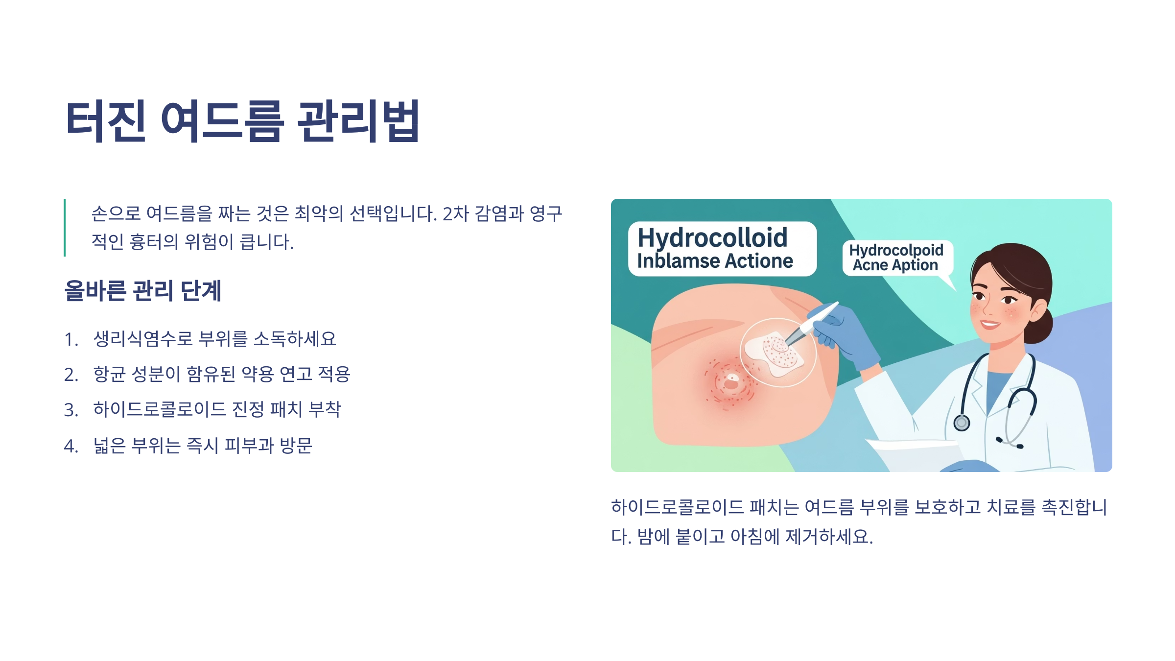 터진 여드름은 관리만 잘해도 흉터 없이 회복이 가능해요. 중요한 건 시기예요. 여드름이 막 터졌을 때 바로 진정과 살균, 재생 케어를 시작해야 해요. 그래야 흔적 없이 깨끗하게 돌아올 수 있답니다. 🩹