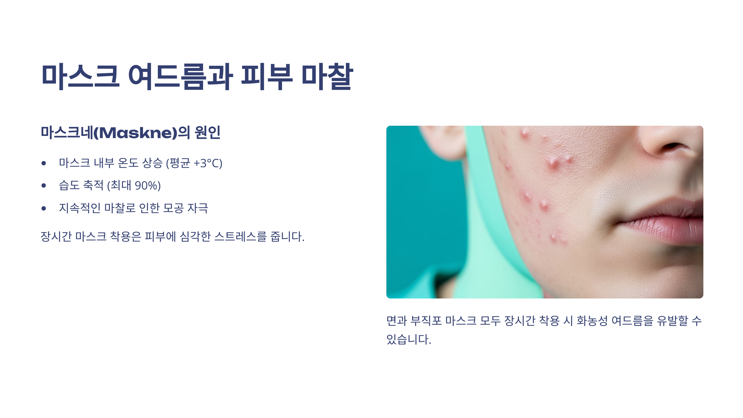 마스크는 피부와 지속적으로 접촉하면서 마찰을 유발해요. 이 마찰은 피부 장벽을 손상시키고, 예민한 사람에게는 곧바로 트러블로 이어질 수 있어요. 특히 코 옆, 턱, 입 주변이 가장 민감한 부위예요.