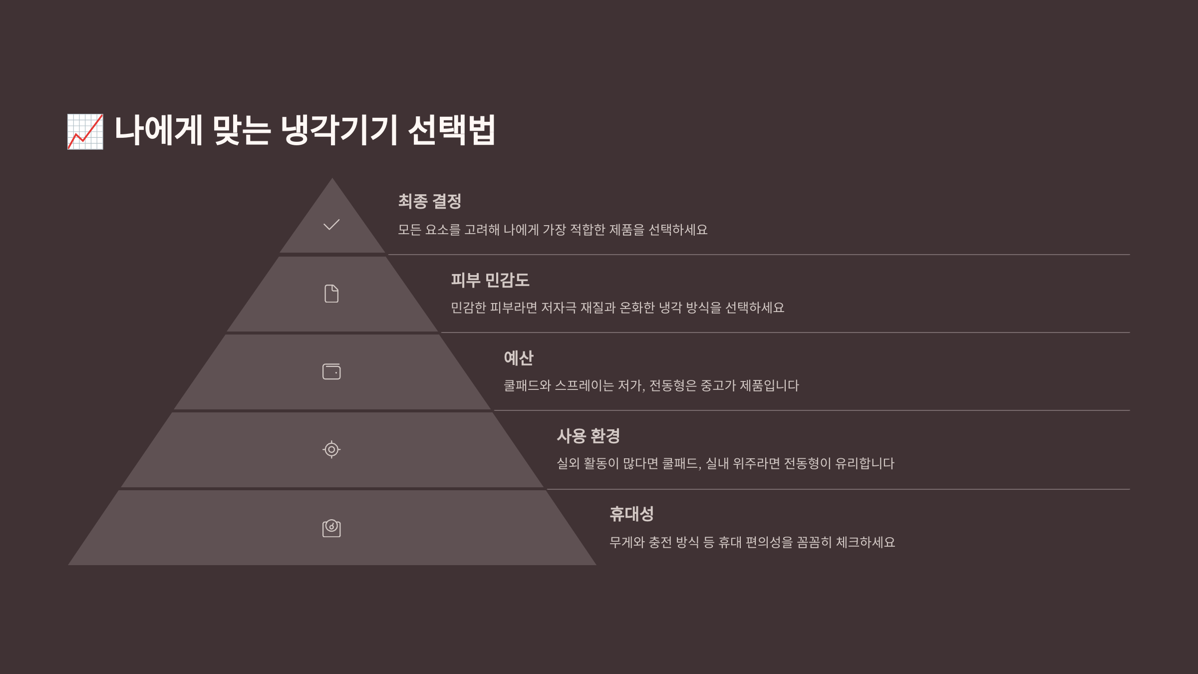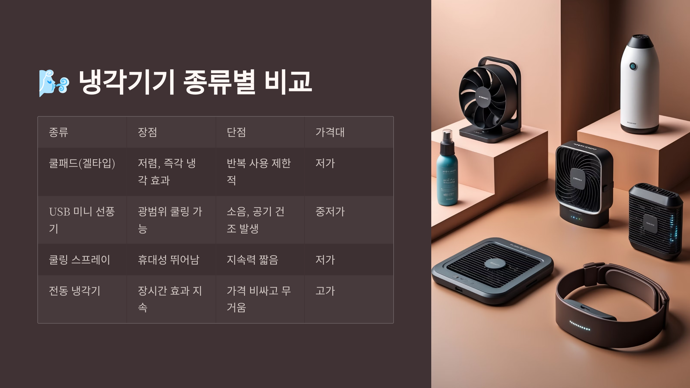 이처럼 다양한 냉각기기 중에서 본인의 활동 스타일이나 열감 정도에 따라 골라보면 만족도가 훨씬 높아져요. 💡