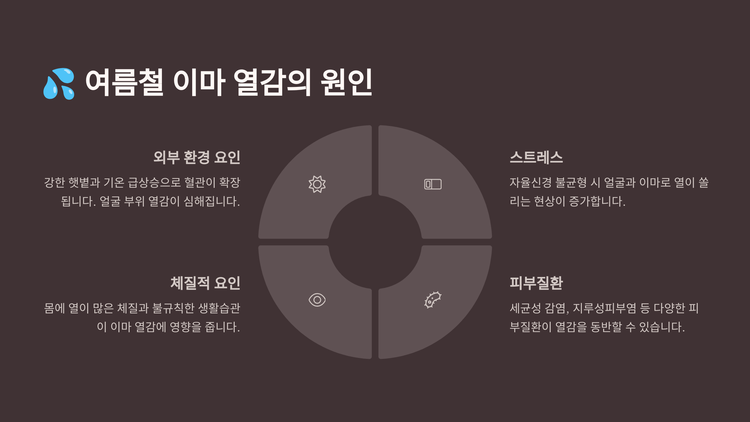 여름이 되면 땀과 열이 올라서 이마에 열감이 생기곤 해요. 사실 이마가 특히 민감한 이유는 해가 직접적으로 닿는 부분이기 때문이에요. 이마에는 땀샘이 많아서 체온을 조절하려고 땀을 흘리는데, 이 과정에서 열이 더해져서 이마가 뜨거워지게 되는 거랍니다.