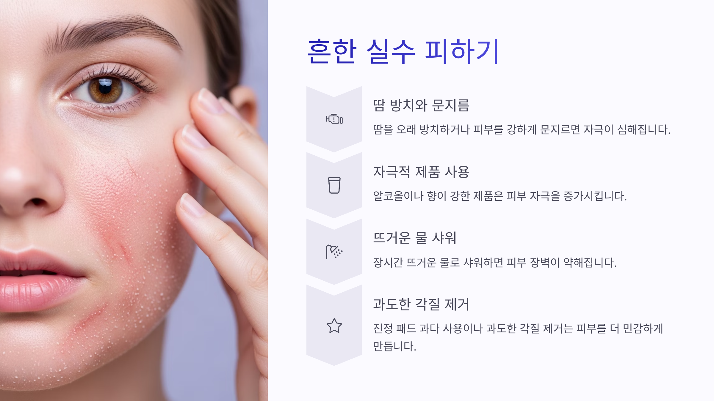 ❌ **자극적인 필링/스크럽 사용** 뒤집힌 피부에 각질 제거한다고 강한 스크럽을 사용하는 건 절대 금물이에요. 민감한 피부는 장벽이 약해져 있기 때문에 물리적 자극에 더 취약해요. 각질 제거는 진정된 후에 부드러운 AHA/BHA로 하는 게 좋아요.