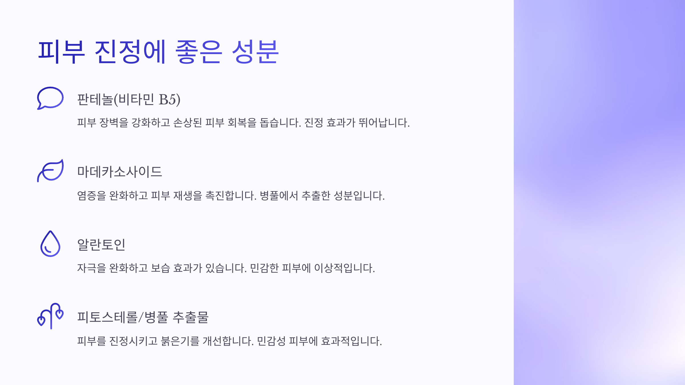 피부가 민감해졌을 땐 어떤 성분이 들어 있는지 꼼꼼하게 확인하는 것이 정말 중요해요. 진정 효과가 입증된 자연 유래 성분부터 피부 장벽을 강화해주는 활성 성분까지, 여름철에 찰떡같이 맞는 성분들을 소개할게요!