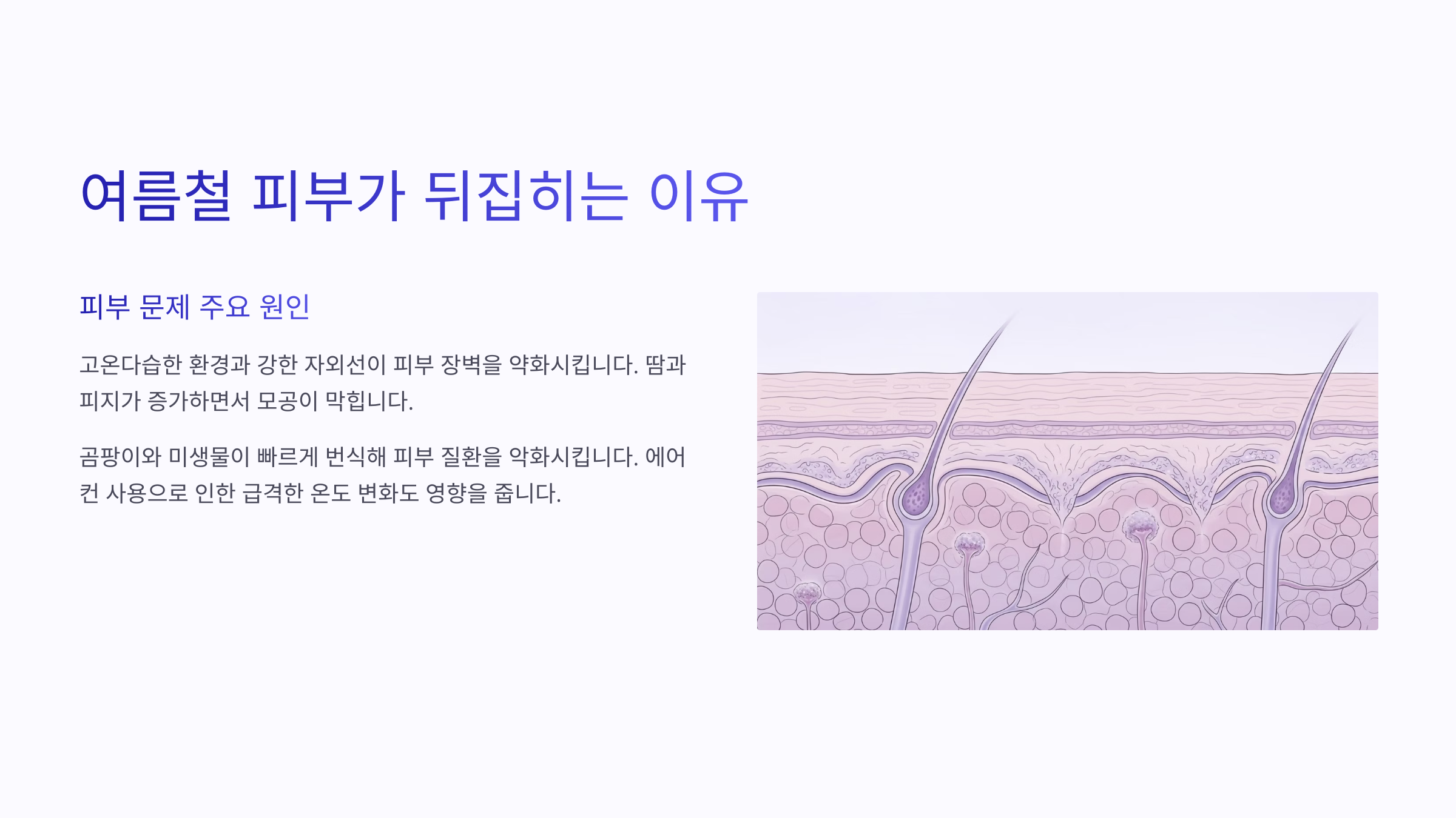 A1. 고온다습한 환경, 자외선, 땀과 피지 증가, 에어컨 바람 등이 피부 장벽을 무너뜨리기 때문이에요. 이로 인해 피부가 쉽게 자극받고 트러블이 생기기 쉬운 거예요.