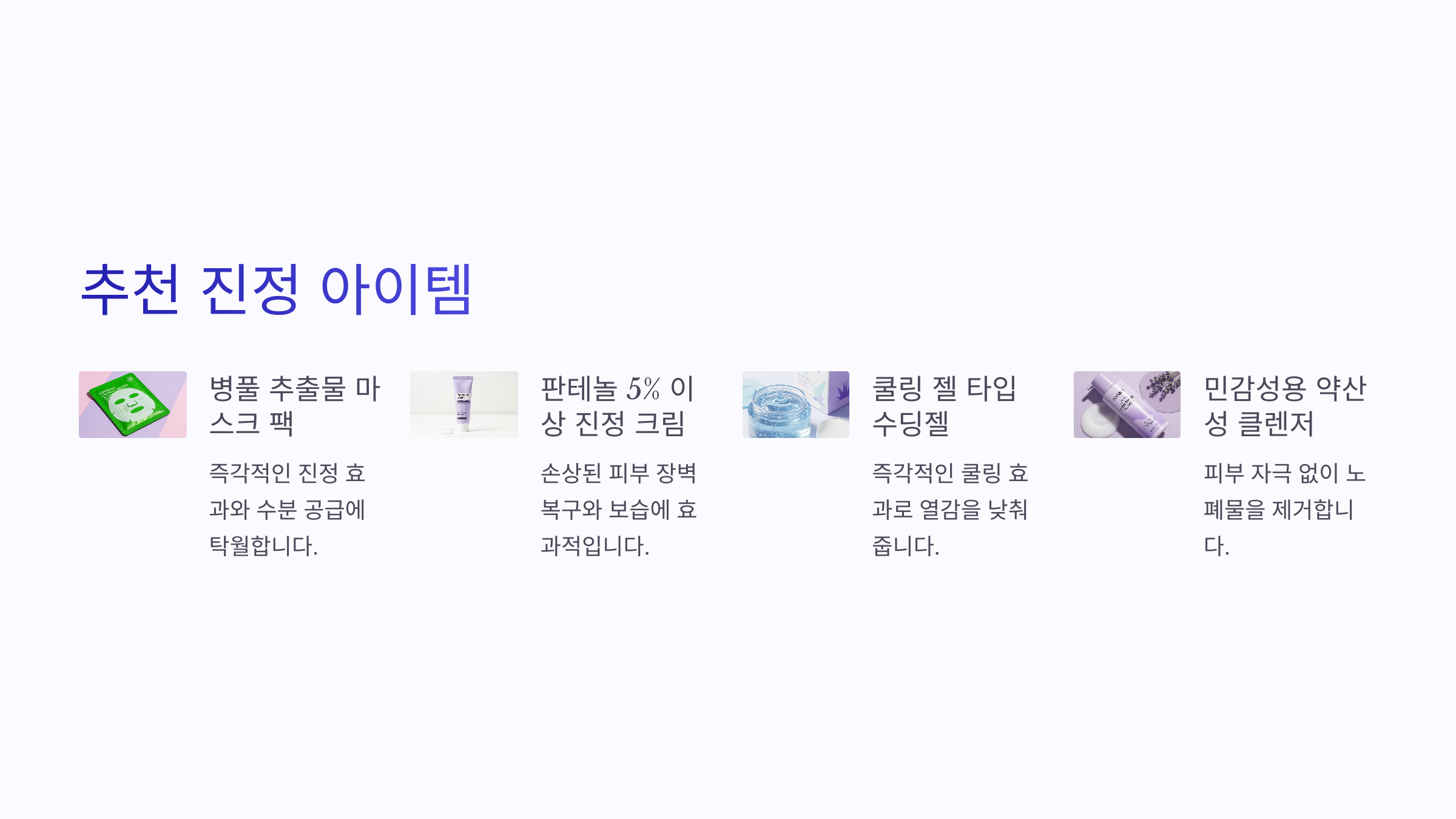 피부가 예민해졌을 때는 어떤 제품을 쓰느냐가 정말 중요해요. 지나치게 화학 성분이 많거나 향이 강한 제품은 피해야 하고, 순하면서도 효과적인 진정 기능이 있는 제품을 선택하는 게 좋아요. 여기, 여름철 뒤집힌 피부를 위한 추천템 리스트를 모아봤어요!