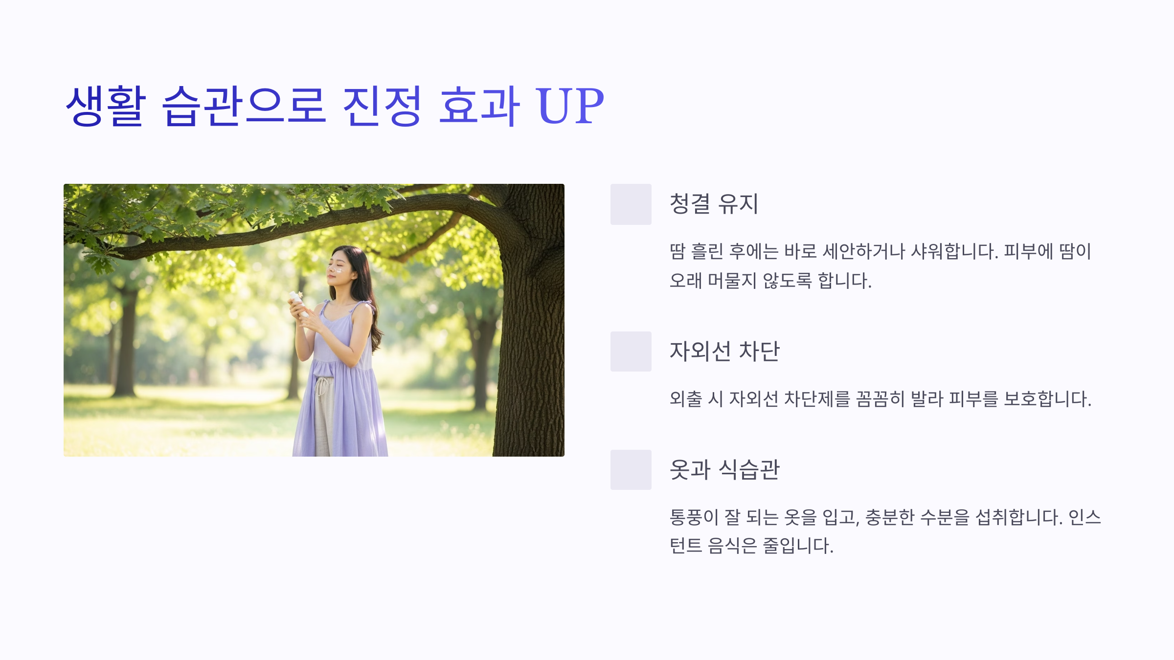 이제 제품까지 골랐다면, 다음으로는 일상생활 속에서 피부 진정을 도와주는 생활 습관도 함께 보면 좋아요! 아무리 좋은 제품을 써도 생활습관이 잘못되면 효과가 줄어들 수 있어요 🙌