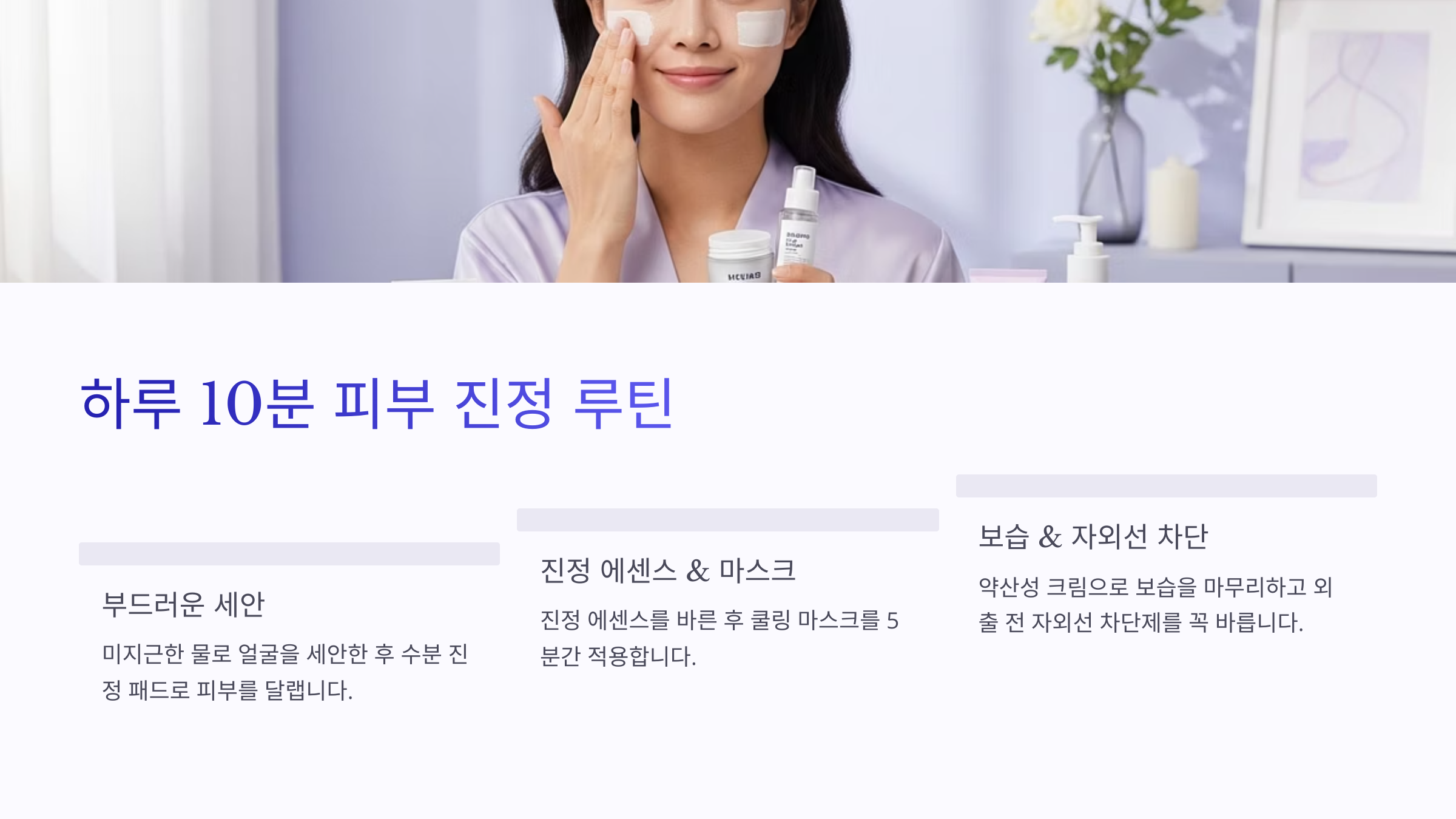 예민해진 여름 피부를 관리하기 위해서는 무조건 복잡하거나 고가의 제품을 사용할 필요는 없어요. 오히려 간단하고 일관된 루틴이 피부 진정에 훨씬 효과적이에요. 하루 10분, 아침과 저녁으로 실천할 수 있는 루틴을 알려줄게요.
