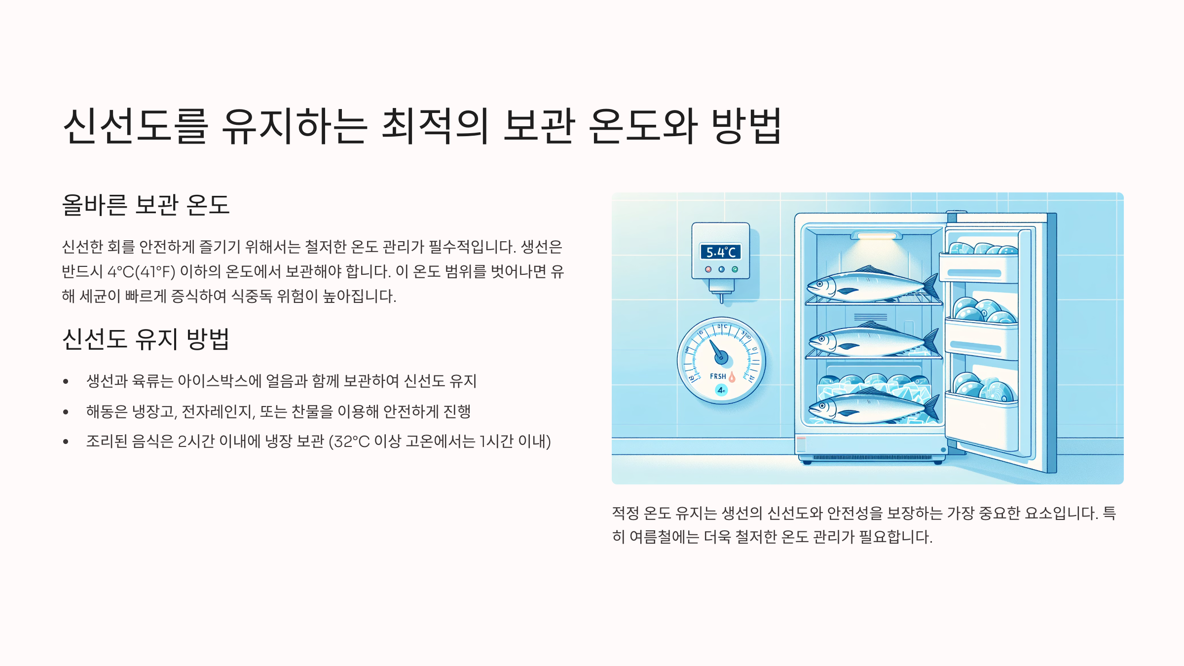 회를 안전하게 먹기 위해 가장 중요한 건 뭐니 뭐니 해도 '온도 관리'예요. 생선은 온도에 민감해서 조금만 따뜻해져도 세균이 활발하게 자라기 시작해요.
