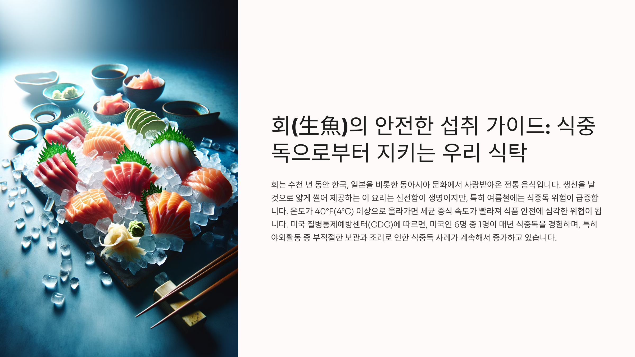 그래서 회를 보관할 때는 반드시 4℃ 이하, 즉 냉장 보관이 필수예요. 이동할 때도 아이스박스나 아이스팩으로 저온 상태를 유지해야 하고요.