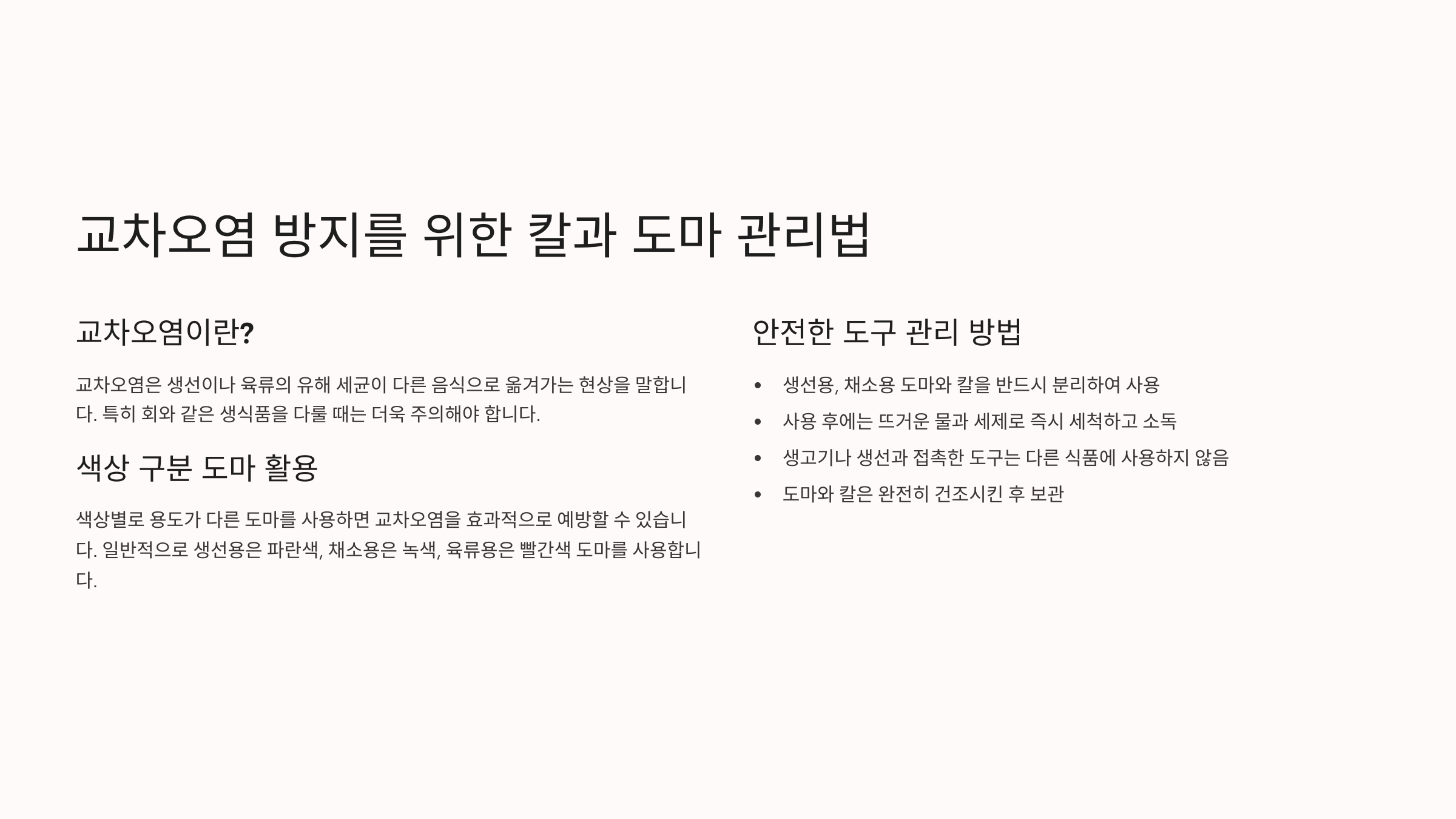 회를 썰 때 어떤 도마와 칼을 쓰느냐에 따라 식중독 위험이 달라진다는 사실, 알고 있었나요? 같은 칼과 도마로 생선과 다른 재료를 함께 다루면 '교차오염'이 발생해요.