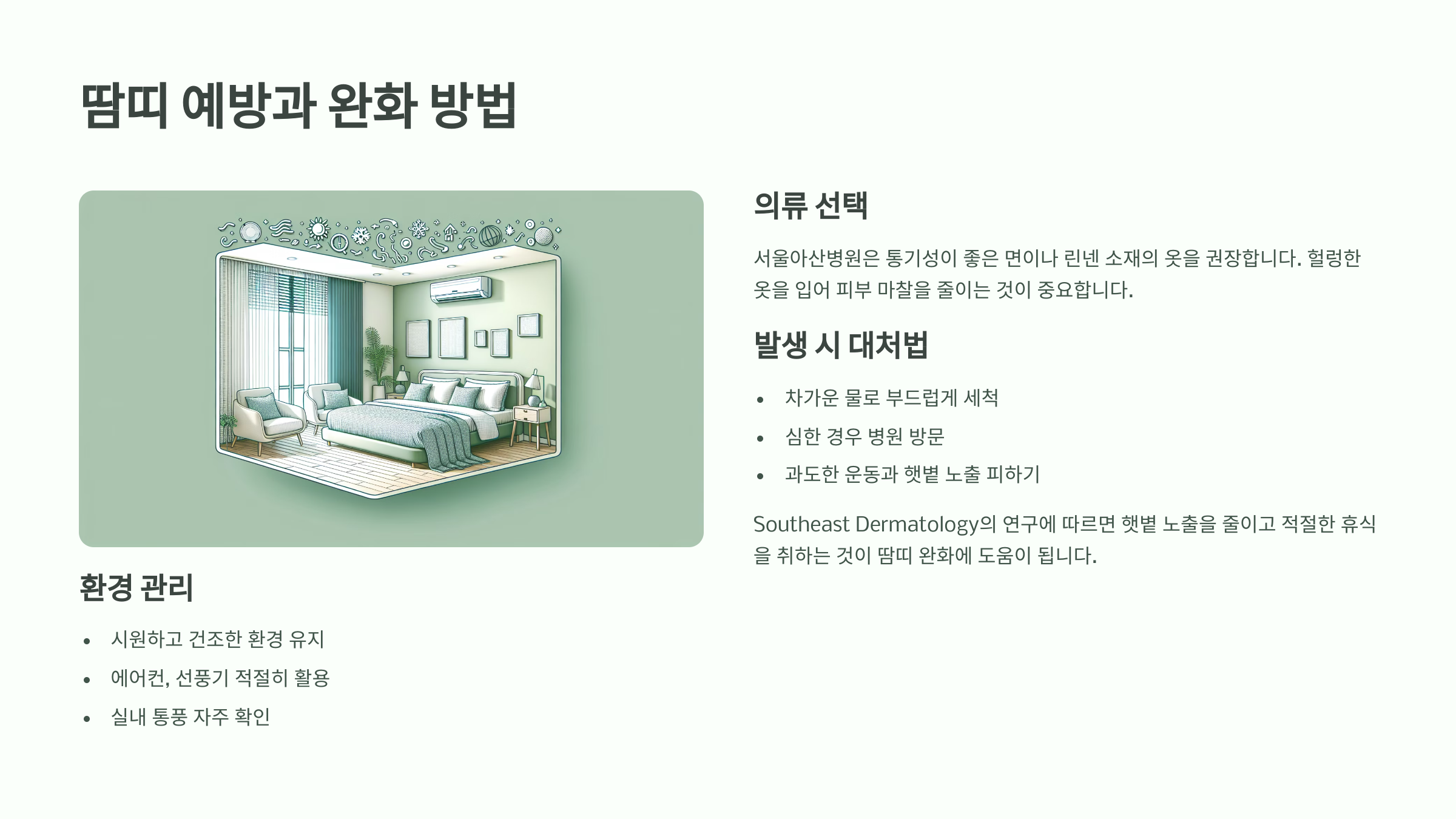 마지막으로 중요한 건 수면 환경이에요. 밤에 덥고 습한 방에서 자면 땀띠가 악화될 수 있어요. 시원한 온도로 유지되면서도 건조하지 않도록, 적절한 습도 조절과 침구류 청결 상태를 관리해줘야 해요.