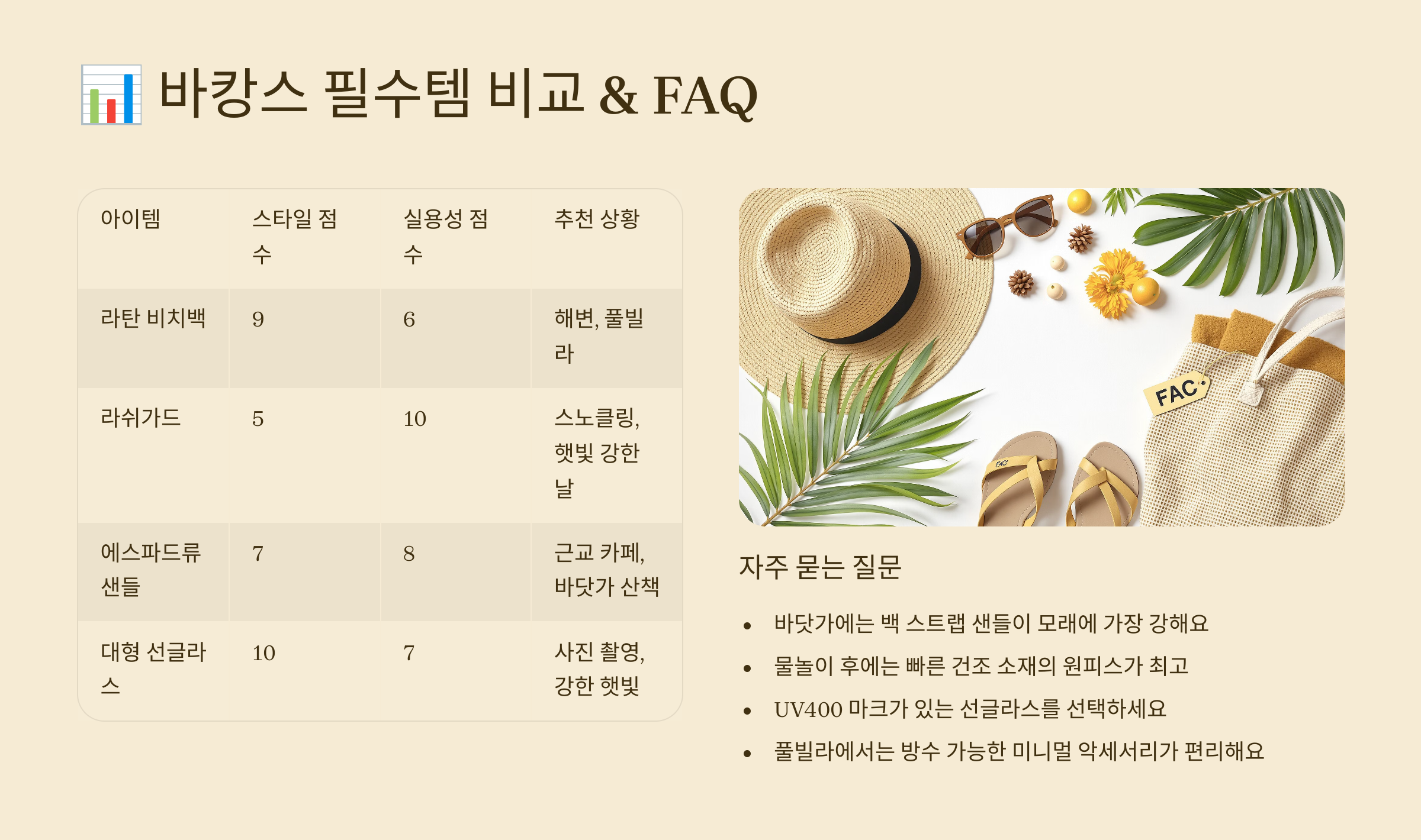지금까지 소개한 다섯 가지 카테고리의 여름 여행 코디 아이템을 한눈에 비교해볼 수 있는 표를 준비했어요. 바닷가와 풀빌라 모두에서 활용 가능한 아이템을 정리했으니, 여행 가방 싸기 전에 체크리스트처럼 활용해도 좋아요!