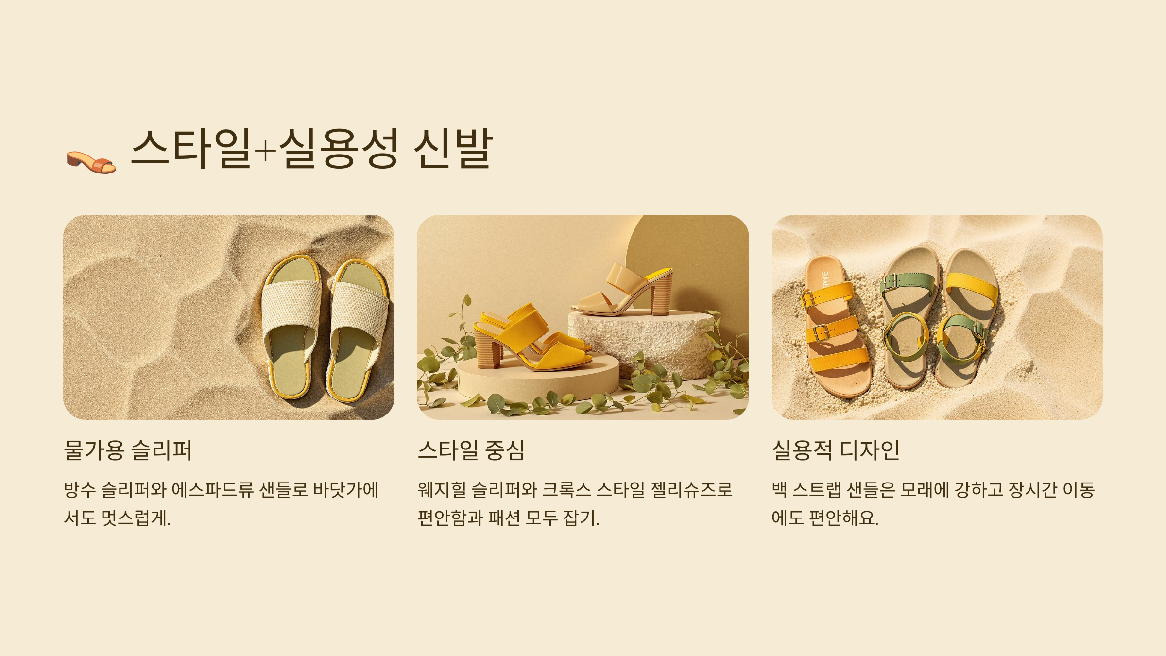 | 신발 | 스트랩 샌들 / 젤리 슬리퍼 | 활동성 + 패션 | 바닷가 + 풀빌라 |